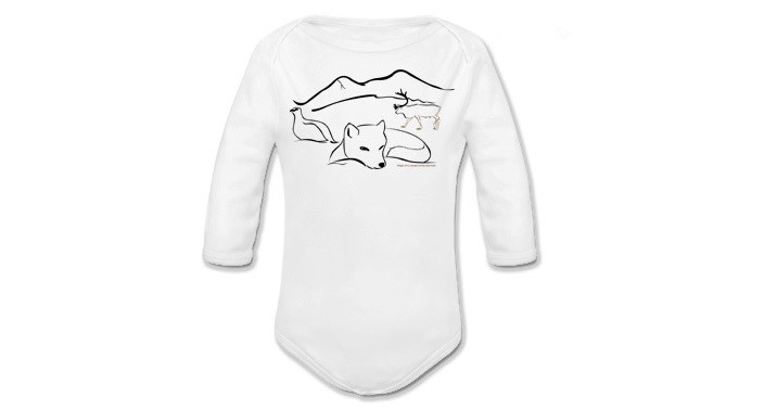 Efter pekboken valde Emma att rikta in sig på kläder och accessoarer för små barn i åldrarna 0-6år. En av de senaste produkterna i raden är en body med tryck. Trycket på bodyn är hämtat ur pekboken och föreställer en fjällmiljö med fjällräven, fjällripan och renen i förgrunden. Bodyn är i ekologisk och fairtrademärkt bomull och tryckt med miljövänliga färger.