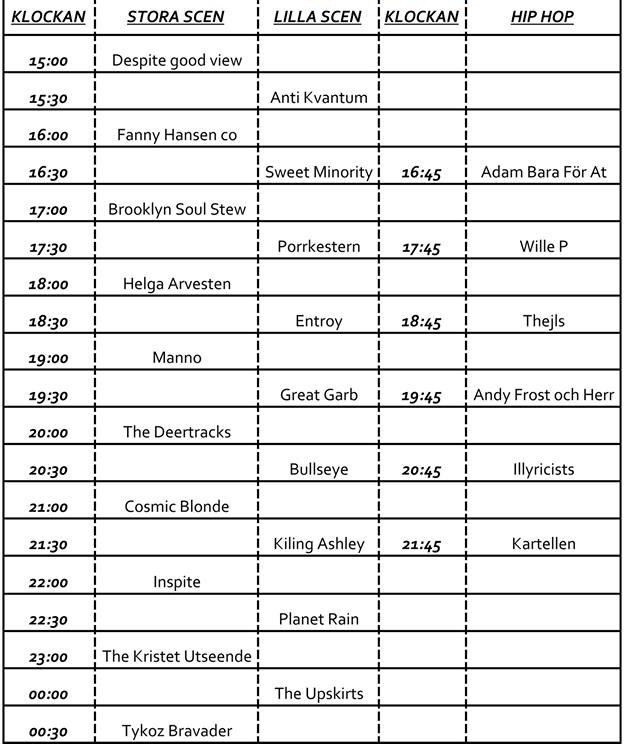 Årets fullständiga lineup Kartellen, The Kristet utseende, Tykoz Bravader, The deer tracks, Brooklyn soul stew, Planet Rain, Illyristics, Porrkestern, The Upskirts, Helga Arvesten, Manno, Cosmic Blonde, Inspite, Fanny Hansen Co, Gustav Lindstein, Anti Kvantum, Thejls, Andy Frost och Herr, Despite good view, Killing Ashley, Great Garb, Entroy, Wille P, Adam