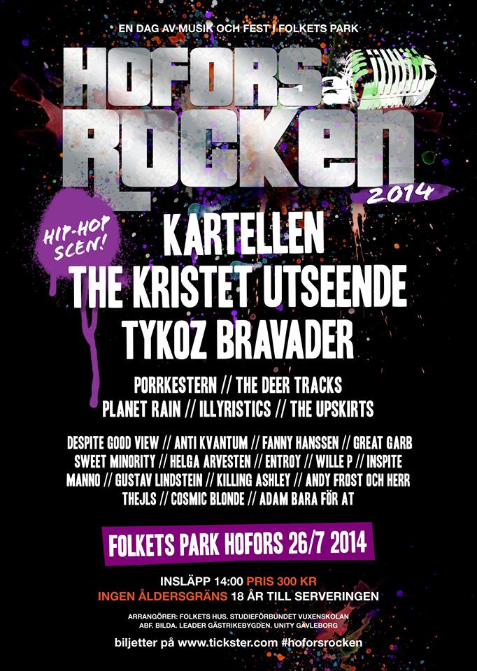 Hoforsrocken 2014 är stolta över att kunna leverera Gästriklands i särklass mest varierade musikupplevelse 2014. Vi har arbetat hårt för att alla typer av musik ska få plats i år och känner att vi fått till en riktigt lyckad blandning. Metal, punk, hiphop, electropop, singer songwriters, soulpop och blues samsas harmoniskt i Sveriges vänligaste kommun, Hofors! På hiphopcenen stoltserar vi i år med den skandalomsusade Kartellen som bjuder på välslipad hiphop med starkt antirasistiska åsikter vilket är något vi på Hoforsrocken stället oss bakom helhjärtat. För er som gillar punk ( alla ) bjuder vi på frälsning av inga mindre än The Kristet utseende. Totalt 25 band på 3 scener med start 1400!