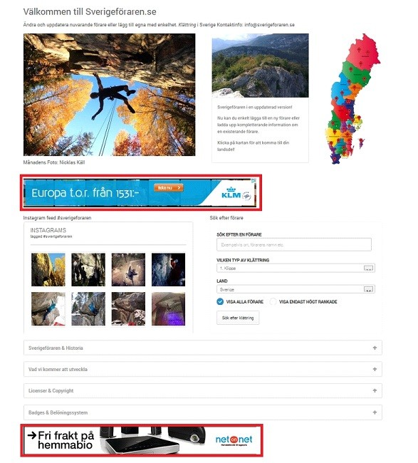 En av Sveriges största klättersidor med samlade förare över hela Sverige. Sverigeföraren har varit aktiv i 8 års tid och har många trogna användare. Att synas hos oss med ett införande gör att ni får fler besökare till er sida som eventuellt kommer generera pengar i form av försäljning.