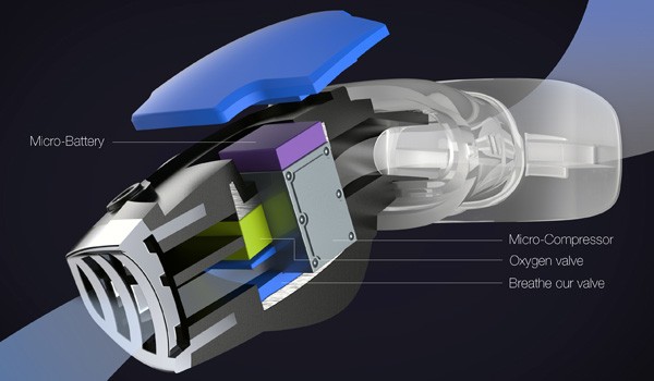 – Med hjälp av en mycket liten men kraftfull mikro kompressor komprimerar den syre och lagrar den i en ackumulatortank.
