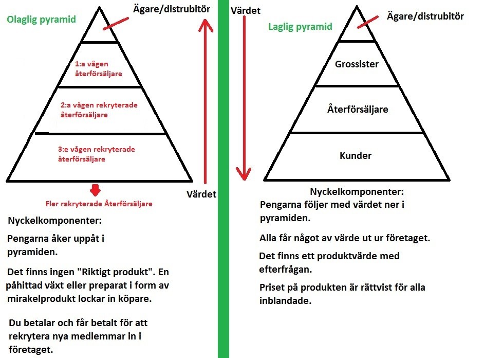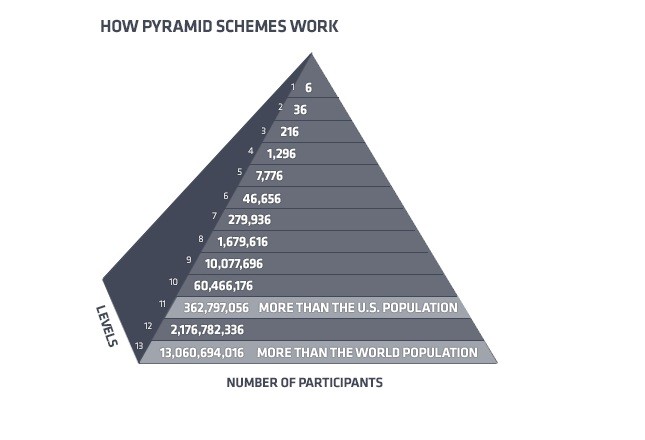 Ägarna sitter på pyramidens topp. Den första vågen av 6 stycken ”återförsäljare” kommer på första blocket. De i sin tur hittar 6 stycken återförsäljare under sig. Hjulet rullar på och vid 12:e vågen är det upp till dom att rekrytera resterande av världens befolkning.